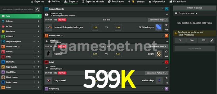 O 599K oferece uma grande seleção de opções de apostas em e-sports com probabilidades competitivas